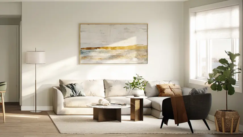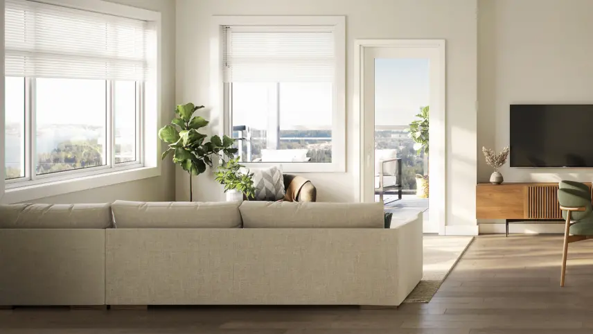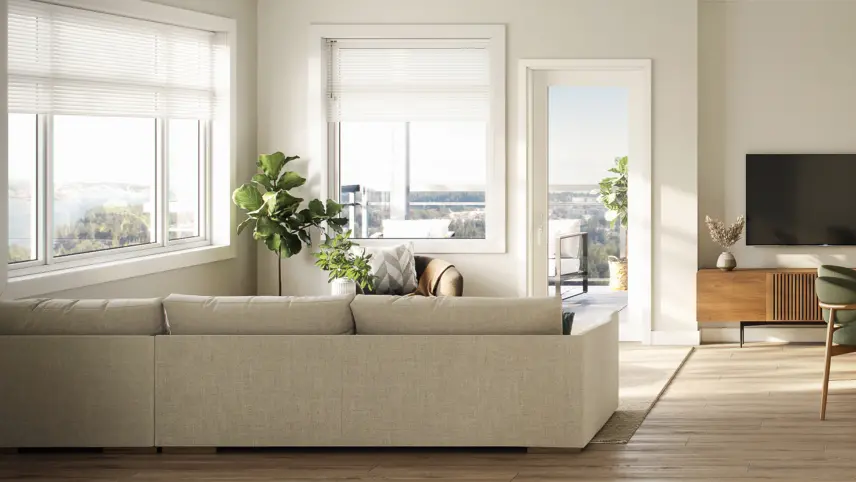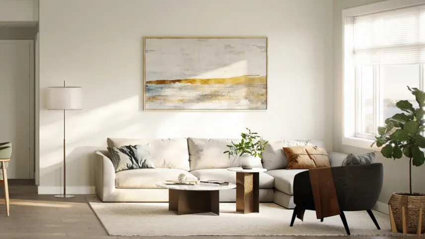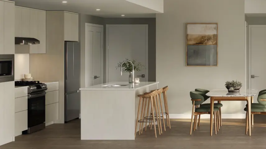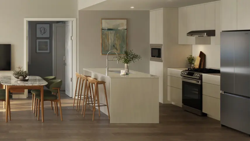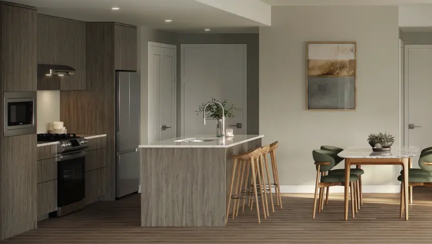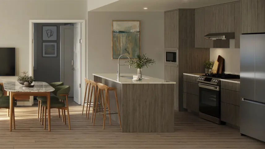 With polished interiors available in two colour palettes, these homes exude sophistication. Architecturally boxed bulkheads and wide plank matte finish laminate flooring add dimension and refinement to living spaces. Kitchens feature premium wood veneer cabinets, quartz countertops, and energy-efficient Samsung appliances, while bathrooms boast designer ceramic tiles, elegant fixtures, and roomy walk-in showers with rain shower heads, giving these spaces a sense of functional refinement.